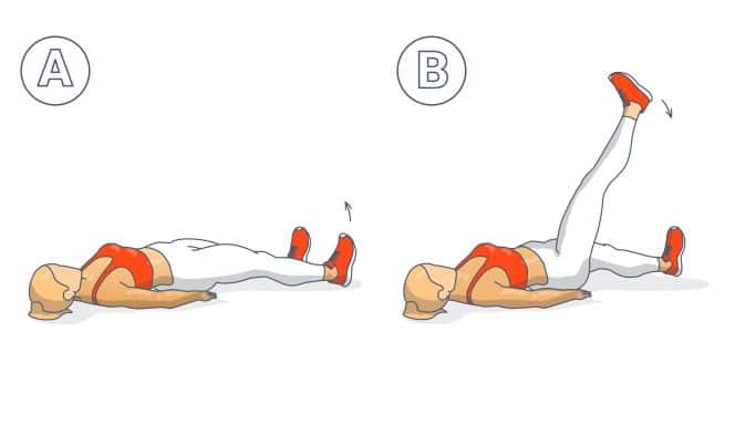 Com as costas eretas no colchão, estique uma das pernas para o alto, elevando o máximo que puder, até chegar na posição de 90°.