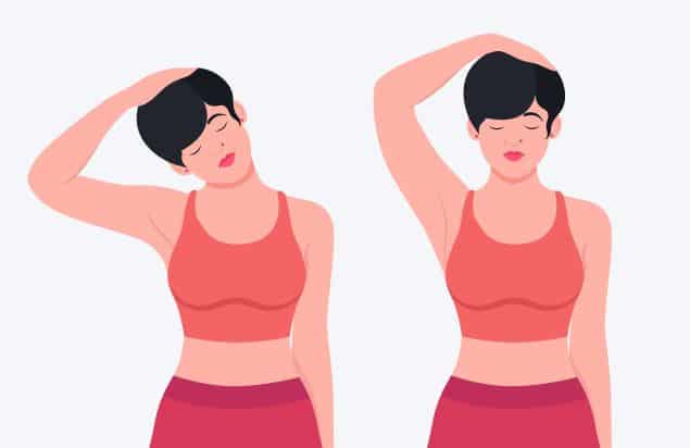 Coloque a mão direita no lado esquerdo da cabeça, por cima, e puxe gentilmente a cabeça para a direita. Depois, troque de lado.