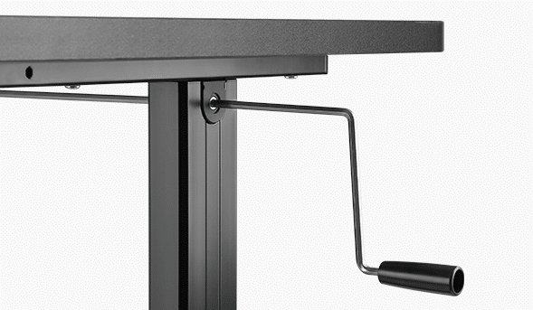 A mesa com ajuste de altura manual depende de uma manivela para regular sua altura máxima. Assim, à medida que o giro é feito o tampo da mesa sobe e desce.